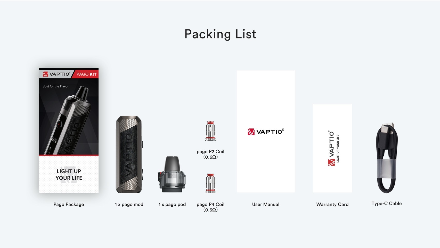 | Vaptio 『PAGO』 | pago綠色套裝, pago紅色套裝, pago藍色套裝, pago黑色套裝, pago黑紅套裝, Vaptio 『PAGO』原廠空倉(1入), Vaptio 『PAGO』成品芯0.3(5入), Vaptio 『PAGO』成品芯0.6(5入) |