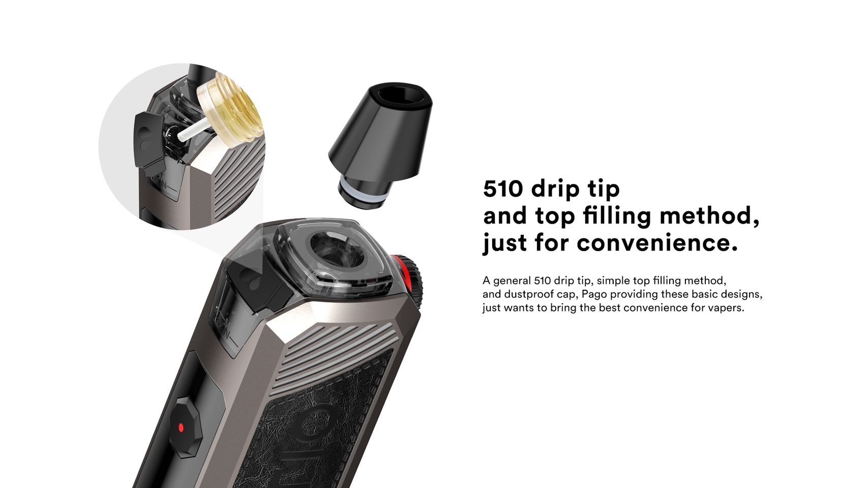 通用的510滴嘴、簡單的頂部注油方式、防塵帽,帕果提供這些基本設計,只是想給電子煙玩家帶來最好的便利。