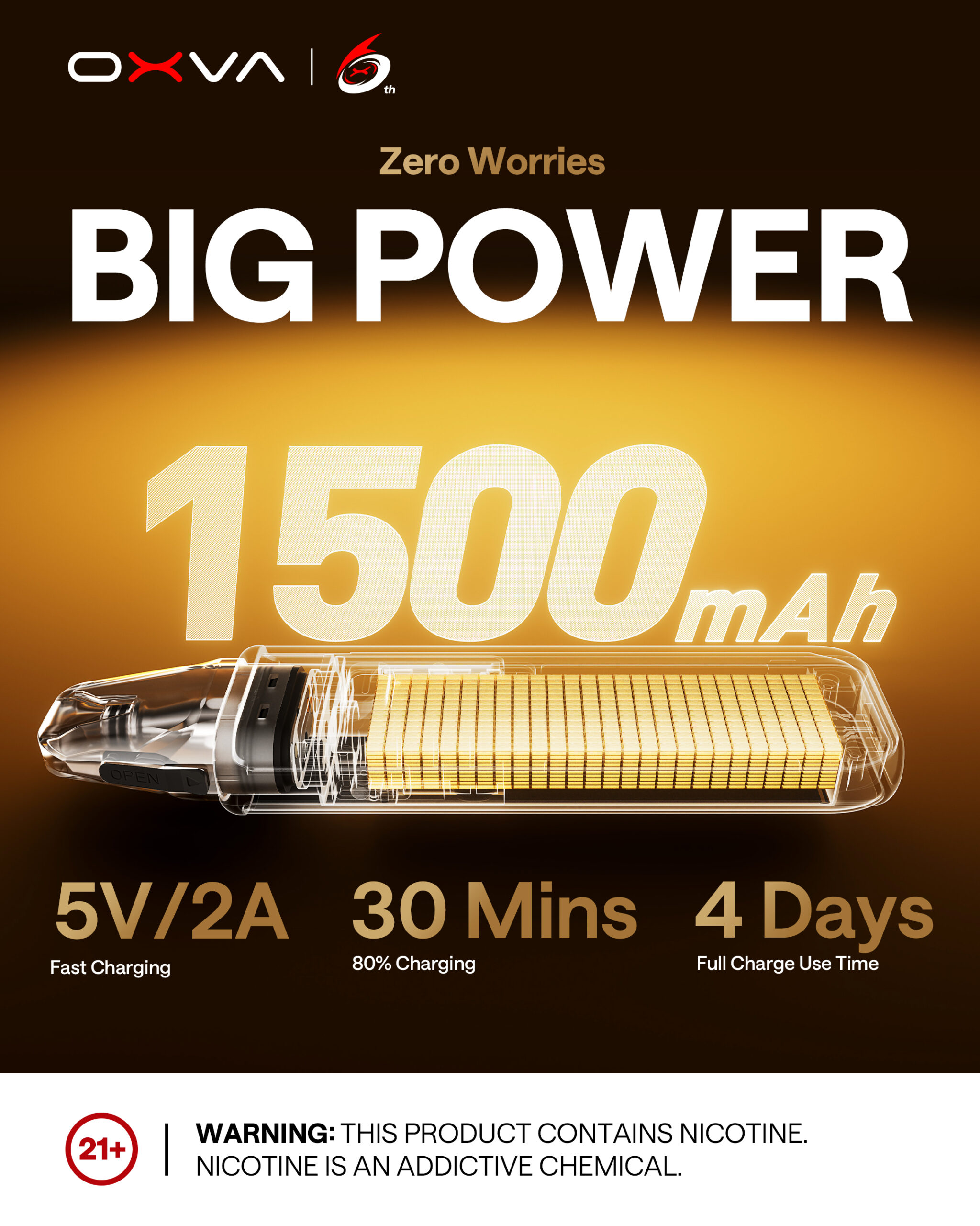 OXVA XLIM 3 ULTRA 採用 1500mAh 大容量電池,支援 2A 快速充電