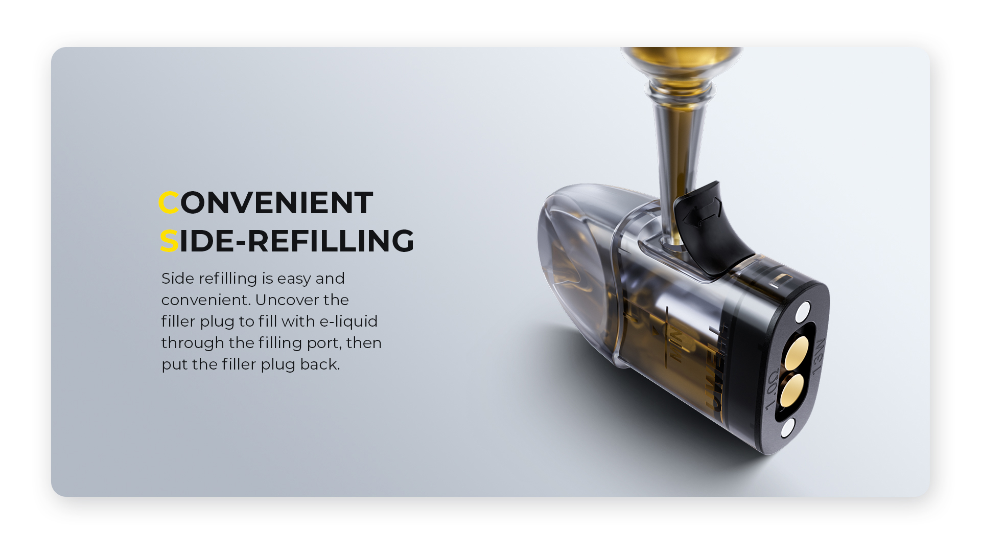 • 側面填充設計:2ml 可填充煙彈,側面填充,方便快捷。
