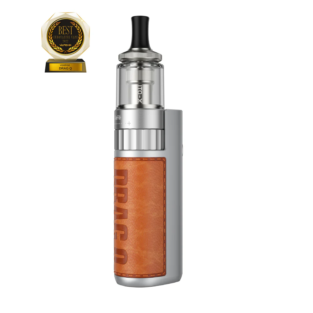 Drag Q Kit 採用皮革機身,鑲嵌金屬框架,保持握感舒適且耐磨。它配備1250mAh內建電池和8-25W輸出功率範圍。 Drag Q採用氣流與功率同步調節,輕柔的滴答聲回授,可精準調節氣流與最佳匹配的輸出功率。 Drag Q採用月牙形進氣口設計,不僅可以避免握持時的卡阻現象,還可以避免因氣流不足而導致煙嘴過熱、爆裂的情況。漸層燈條將顯示即時輸出功率和電池容量。配備ITO霧化技術。 Drag Q Kit 與所有 ITO 線圈相容。 Drag Q 配備 ITO-X Pod,容量為 3.5 毫升。 5 分鐘不活動後,它將自動鎖定。