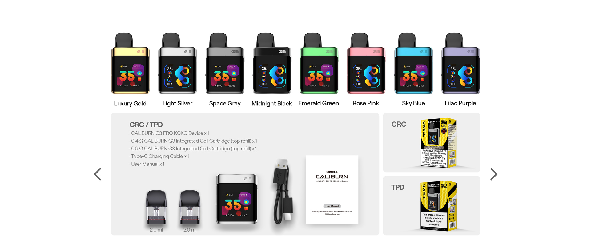 | CALIBURN G3 PRO KOKO咖哩棒 | 午夜黑套裝, 奢華金套裝, 太空灰套裝, 紫色套裝, 銀色套裝, 綠色套裝, 玫瑰粉套裝, 天空藍套裝, 原廠0.4歐姆空煙彈(4入), 原廠0.6歐姆空煙彈(4入), 原廠0.6歐姆空煙彈(4入), 原廠0.9歐姆空煙彈(4入), 優惠套組(主機+日本煙油)下單後私訊客服 |